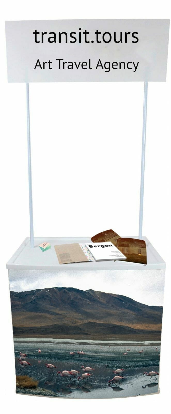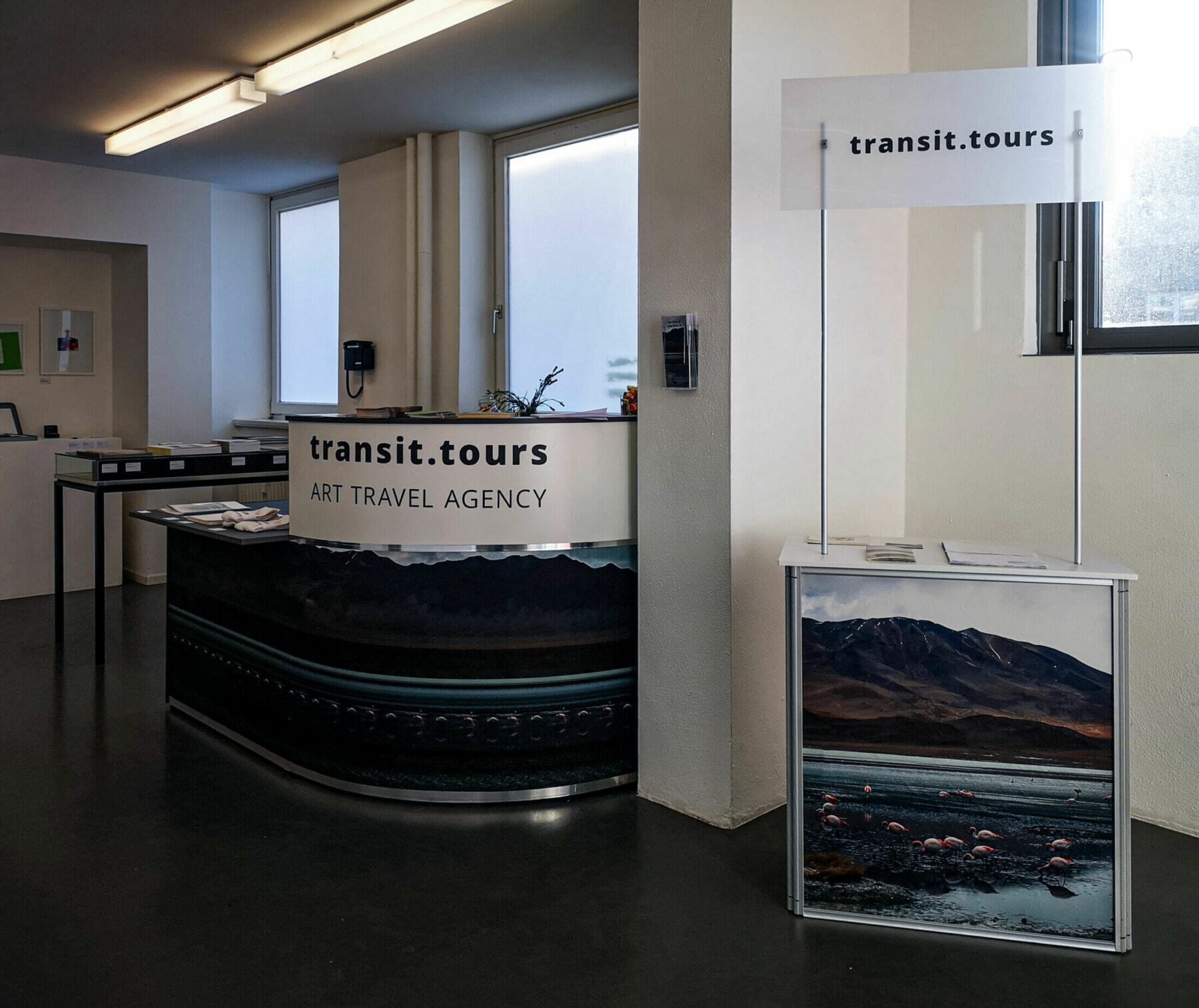 Here, the practice of photography and that of traveling go hand in hand, as they fundamentally overlap significantly in terms of experience. Both travel and photography are characterized by a fragmentary momentariness; if the artist wants to attribute aesthetic experienceability to travel culture, he must expose the culture of experience with an open communication structure. In the case of the artwork transit.tours exhibition stand (2018) as a satellite of the transit.tours art travel agency, the pleasure of the experience is redefined through a processual orientation in the social confrontation with the artist. The wanderlust is aesthetically articulated by the potential customers engaging with this experience and unconsciously transforming the realization of the journey into a subjective narrative with the artist. Posing for and triggering the apparatus are explored as indicative experiences of the traveled body in permanent exchange with the “being on site” and the expectation of “being there”.
