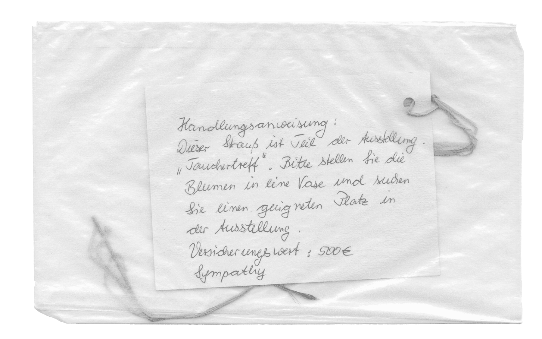 Als Beitrag zu einer Ausstellung entschied ich mich einen Strauß Blumen zu schicken. Im Internet bestellte ich bei einem Blumengeschäft vor Ort einen Strauß der kurz vor der Eröffnung zum Ausstellungsort geliefert werden sollte. Der Strauß sollte an einem beliebigen Ort in der Ausstellung stehen. Als Grußkarte schickte ich daher eine Aufbauanleitung mit, die von dem Blumengeschäft handschriftlich geschrieben wurde und dem Strauß beilag. Das Blumengeschäft ergänzte meinen Text dabei mit dem Wort »Sympathy«.