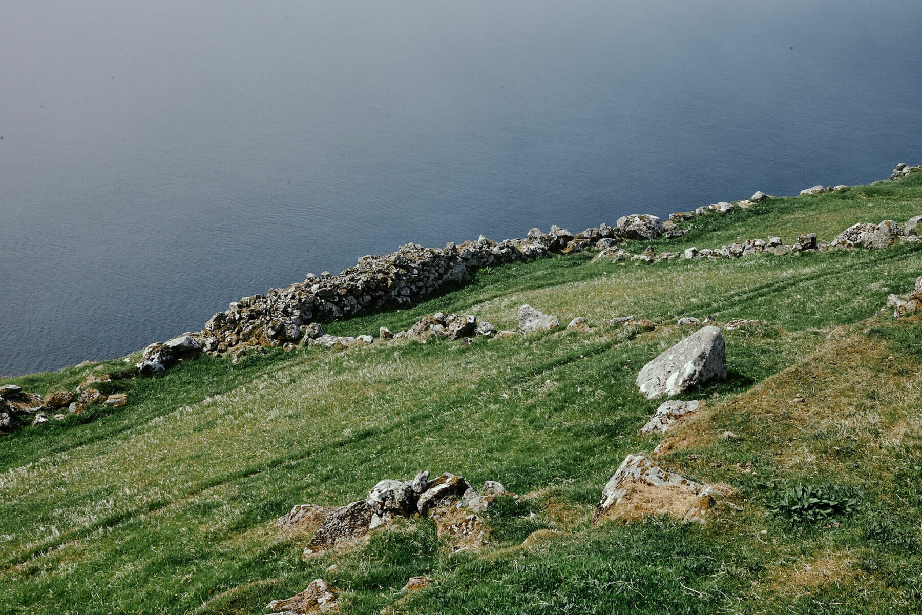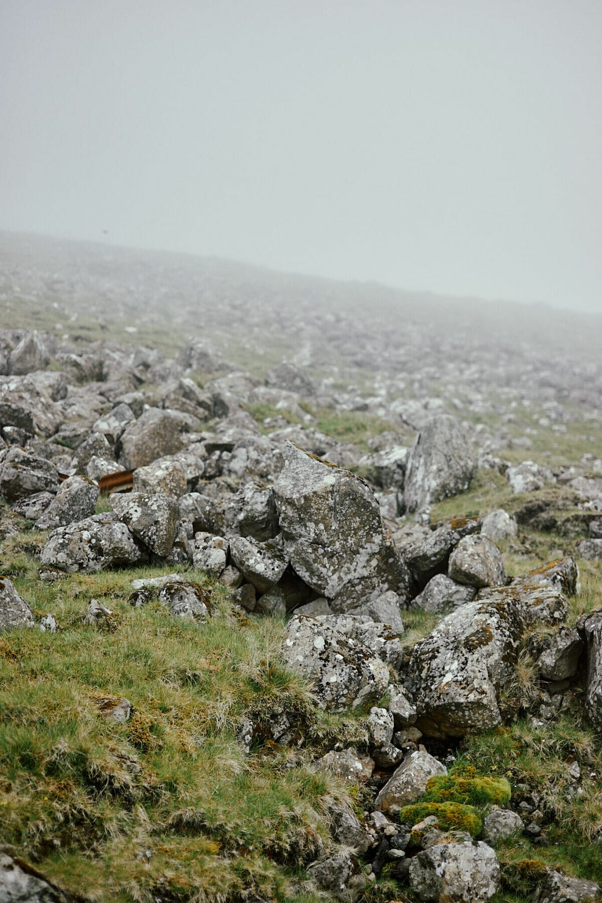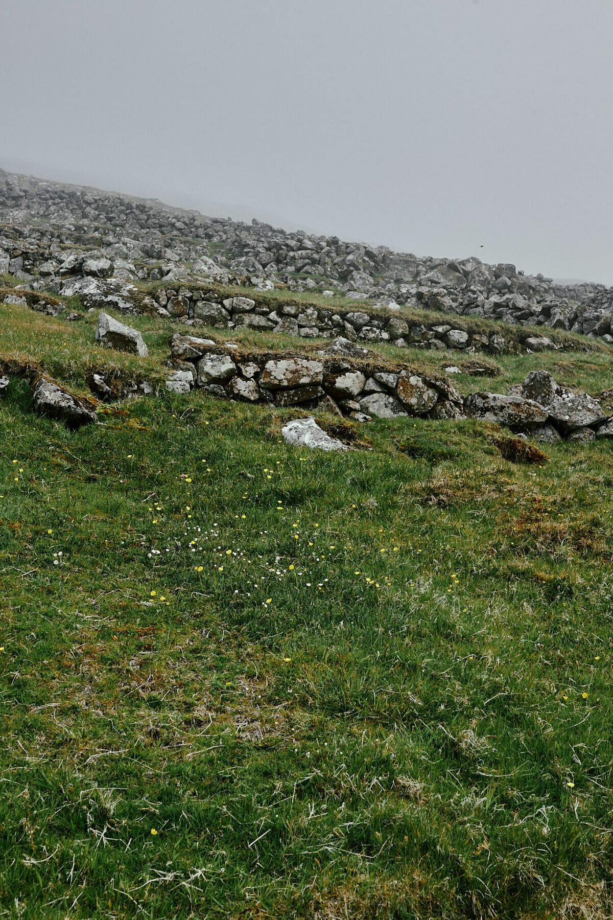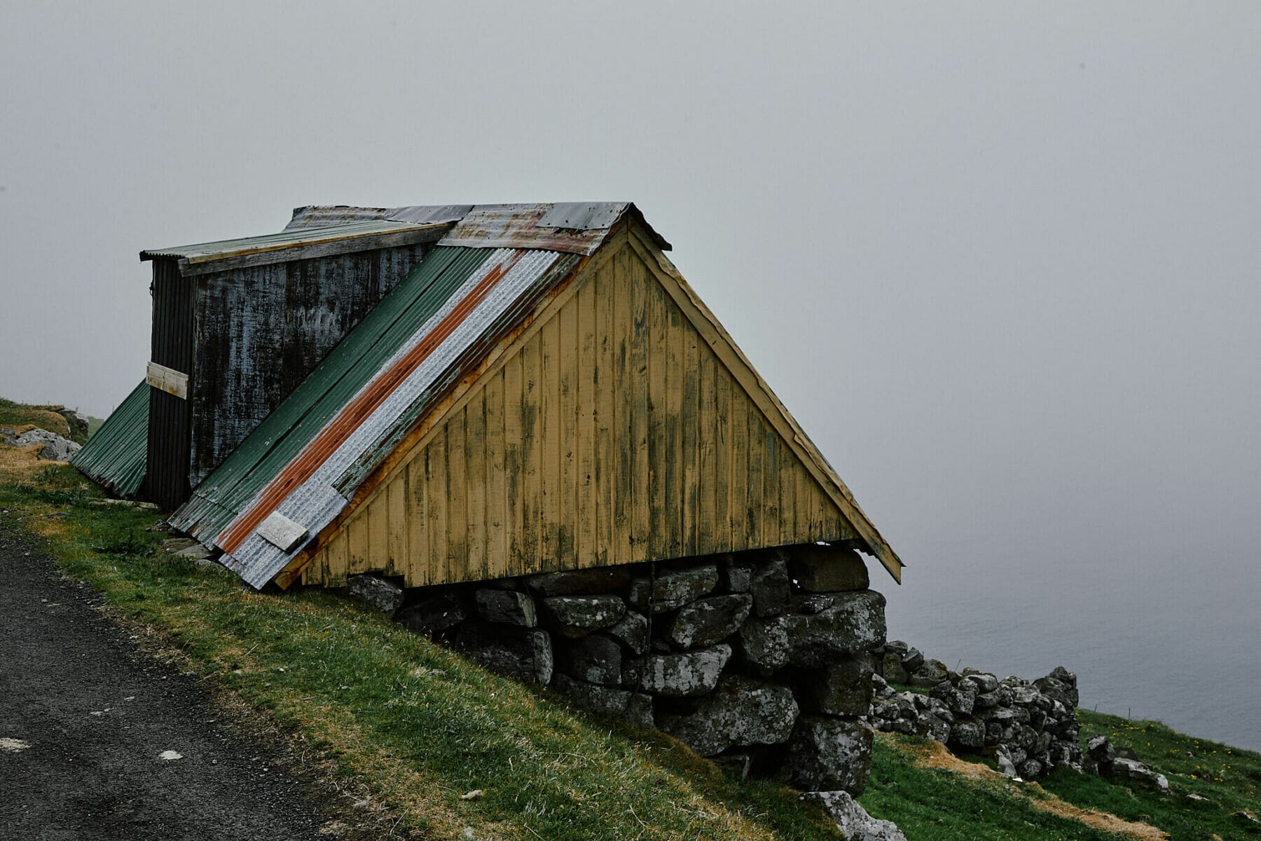 Fugloy, eine der Färöer-Inseln, liegt im Nordatlantik und bietet eine von der Zeit und den Elementen geprägte Landschaft. Besucht Juni 2023.